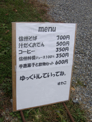 中のご夫婦も気さくな方で、楽しくお話しながら昼食。原っぱと御柱とお宮が見える特等席で信州そばとかとっても豪華! おいしくいただかせていただきました。