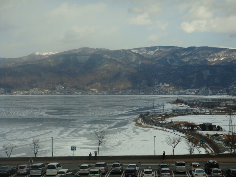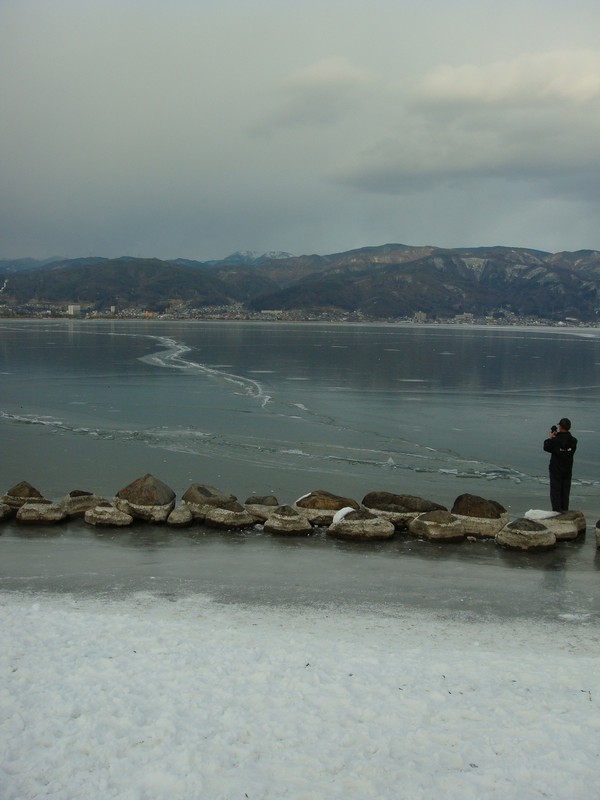 そこから湖沿いを、御神渡りを探しながら諏訪SA側に向かって下っていくと、雪が少なくなり湖面の凍結が綺麗に見えるように。