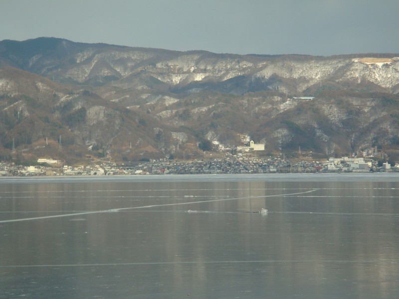 遠くて御神渡りがあるかないか分からないものの、湖面の完全凍結の様子がよく分かります。