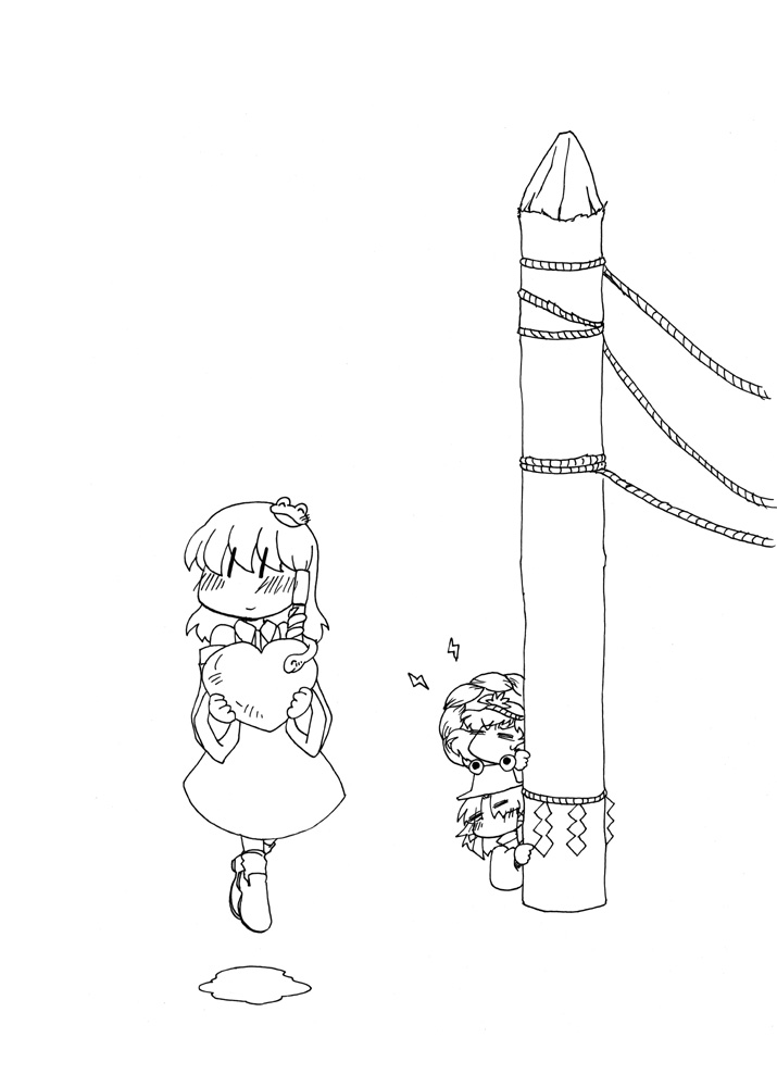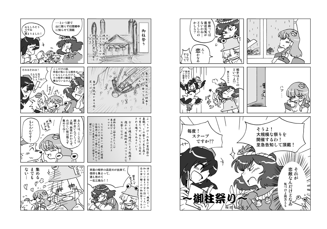 ため息つく早苗さんを見て「これは恋わずらい? よかろう、ではオンバシラ祭りだ!」と神奈子さまがびみょんに暴走するすっとこ4コマ。