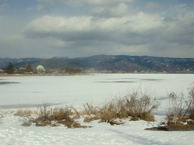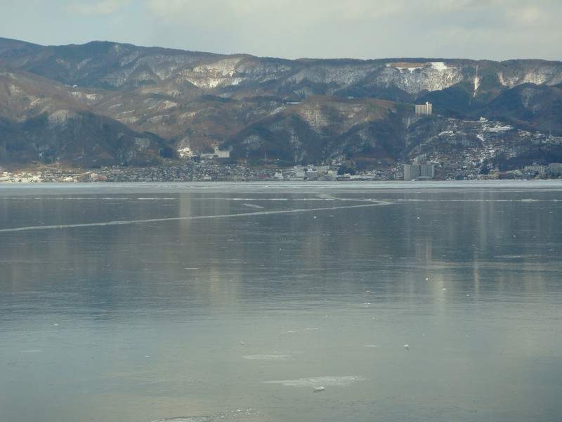 遠くて御神渡りがあるかないか分からないものの、湖面の完全凍結の様子がよく分かります。