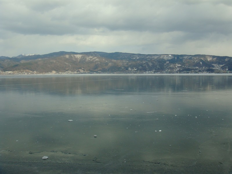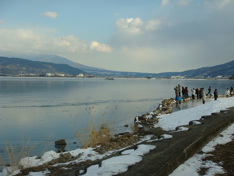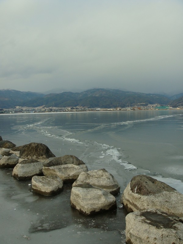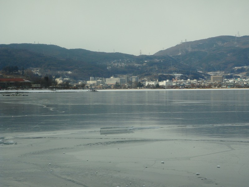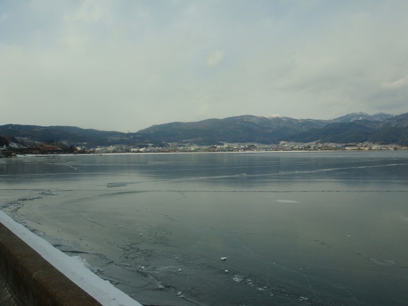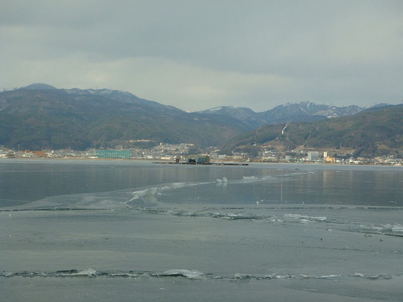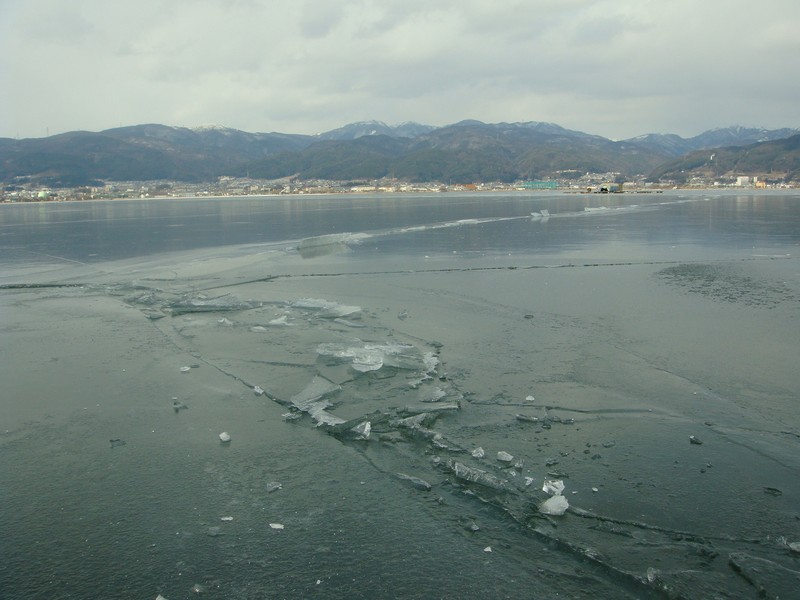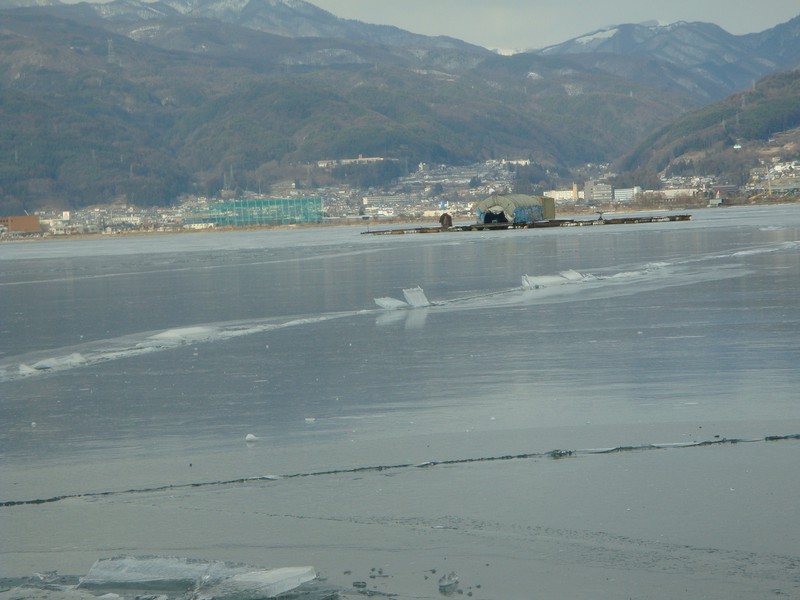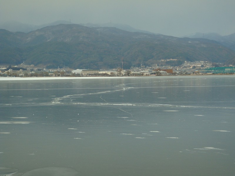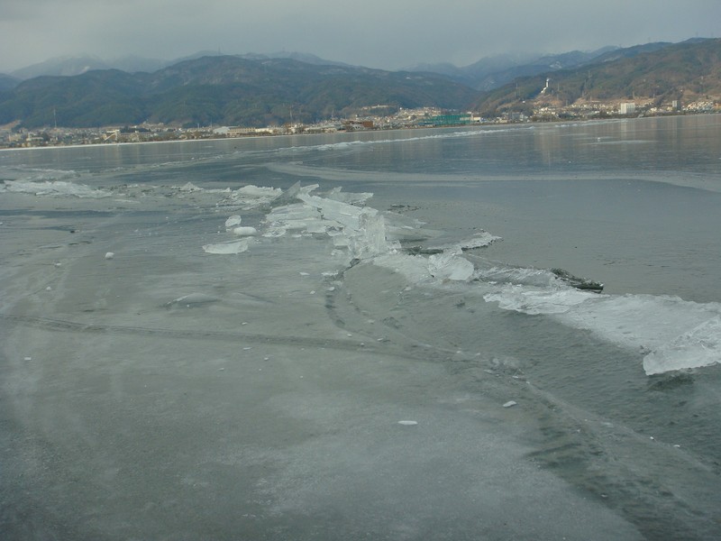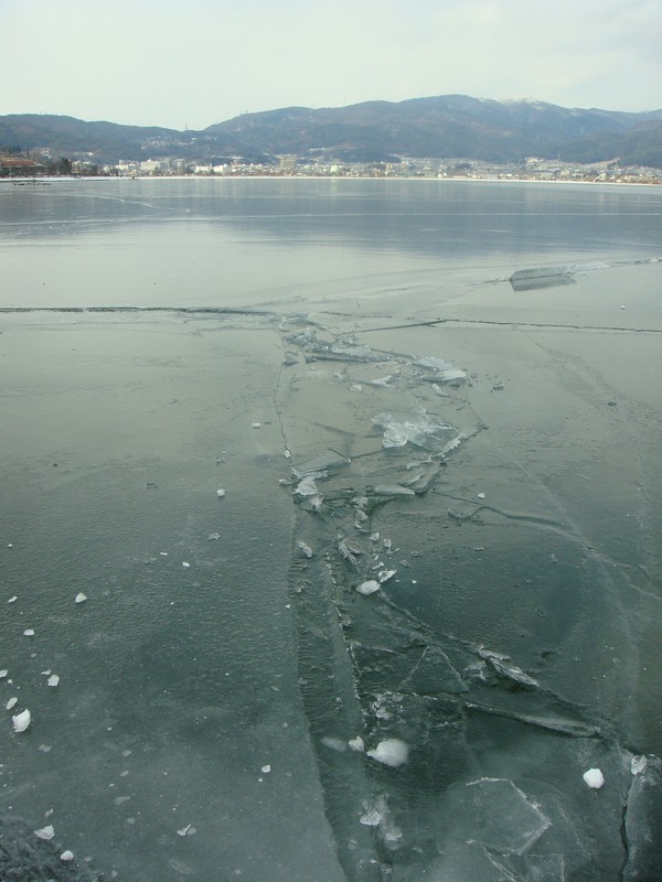 そこから湖沿いを、御神渡りを探しながら諏訪SA側に向かって下っていくと、雪が少なくなり湖面の凍結が綺麗に見えるように。