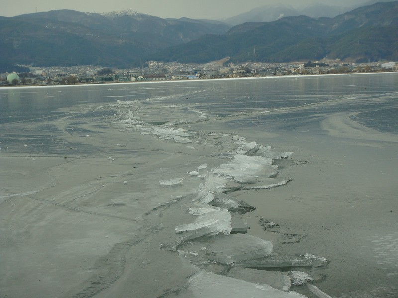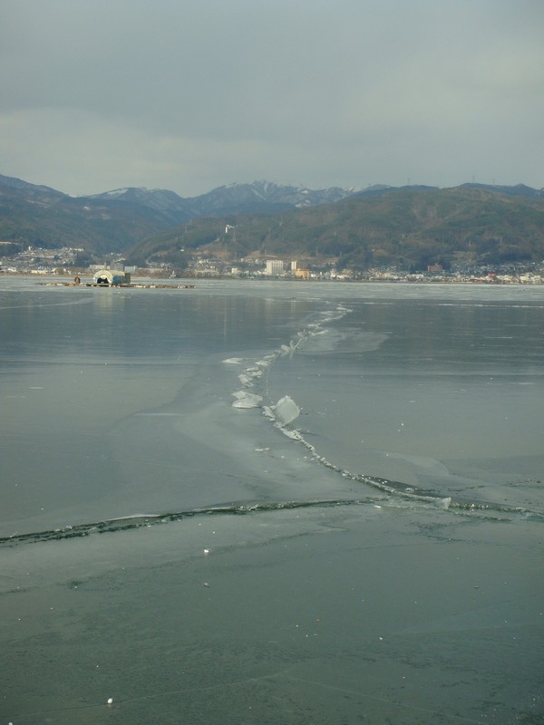 バシバシに入った亀裂の先に、先ほどの茶柱・・・じゃない氷の立った御神渡り。