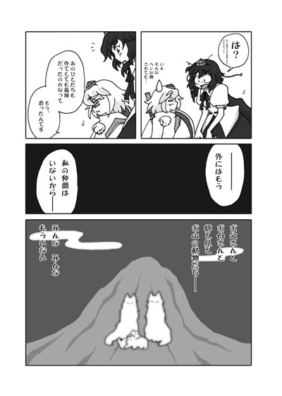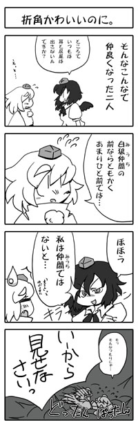 (余談ですが自分とおおかみいぬ氏とオウハクさん以外で、椛の同僚ズを描いている方を始めてお見掛けしたような・・・(^w^*) 同僚からも微妙にかわいがられたりする椛は良いものです!)