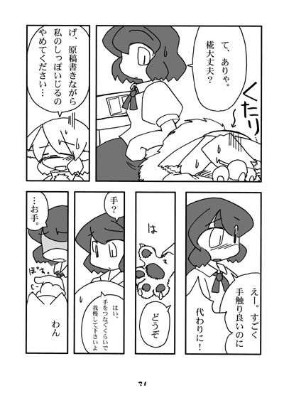 「周りの本が売切れている+椛は現在とても人気者になっているらしい=椛本が手に入らない!」という図式に愕然とするも、自分のところの本が売り切れるなり烏天狗並の速度でお隣の椛&橙本(売り子中もずっと気になっていましたっ)をゲット! なんというわんにゃんお姫様抱っこ!! そのままめぼしいわんこ本を手に入れ、続き物の2しか置いてなくて紅楼夢で出たらしき1が置いてなかった某「わふぅ~」本はとら委託に託し、