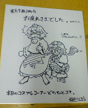 そしていらしてくださった文コスの某氏ありがとうございます。何やら色々と対応に追われ、あまりお話できずすみませんでした。椛コスの方も、寄っていただきましてありがとうございました。なんという良い尻尾! 思わずうちのモミジ柄フリスビーを差し出したら、ご自分のやっぱり似たようなフリスビーを「持ってますw」と差し出されて噴きました(笑) むしろ一本足下駄とかすごいです! 愛ですね!? コスプレコーナーでやってたネタポーズとか笑わせていただきました。最初は椛のスカートめくってる魔理沙→周囲の「そこは文だろう!」コールに答え風神録文颯爽と登場する→しかしカメラ出すどころか顔つっこみそうな勢いでやっぱりスカートめくって覗いてるよオイ!! その時の撮影者は多かったのに後の格好良いポーズはあっという間に終わっちゃって皆どんだけネタ好きなんだよよヲイ! 相方に携帯写真で撮って見せたらやっぱり噴いてました(笑) ・・・ちなみにアフター用の色紙はそのネタ使わせていただきましたっ(てネタ好きはお前もかよ!(笑))